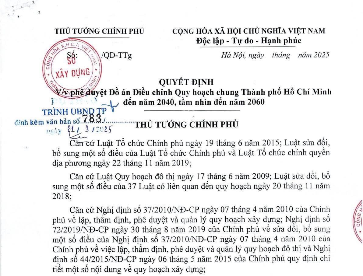 Trên cơ sở đó, TPHCM thống nhất trình Thủ tướng Chính phủ xem xét, ban hành Quyết định phê duyệt nhiệm vụ điều chỉnh quy hoạch chung TPHCM cũng như Nhiệm vụ quy hoạch chung TP Thủ Đức.