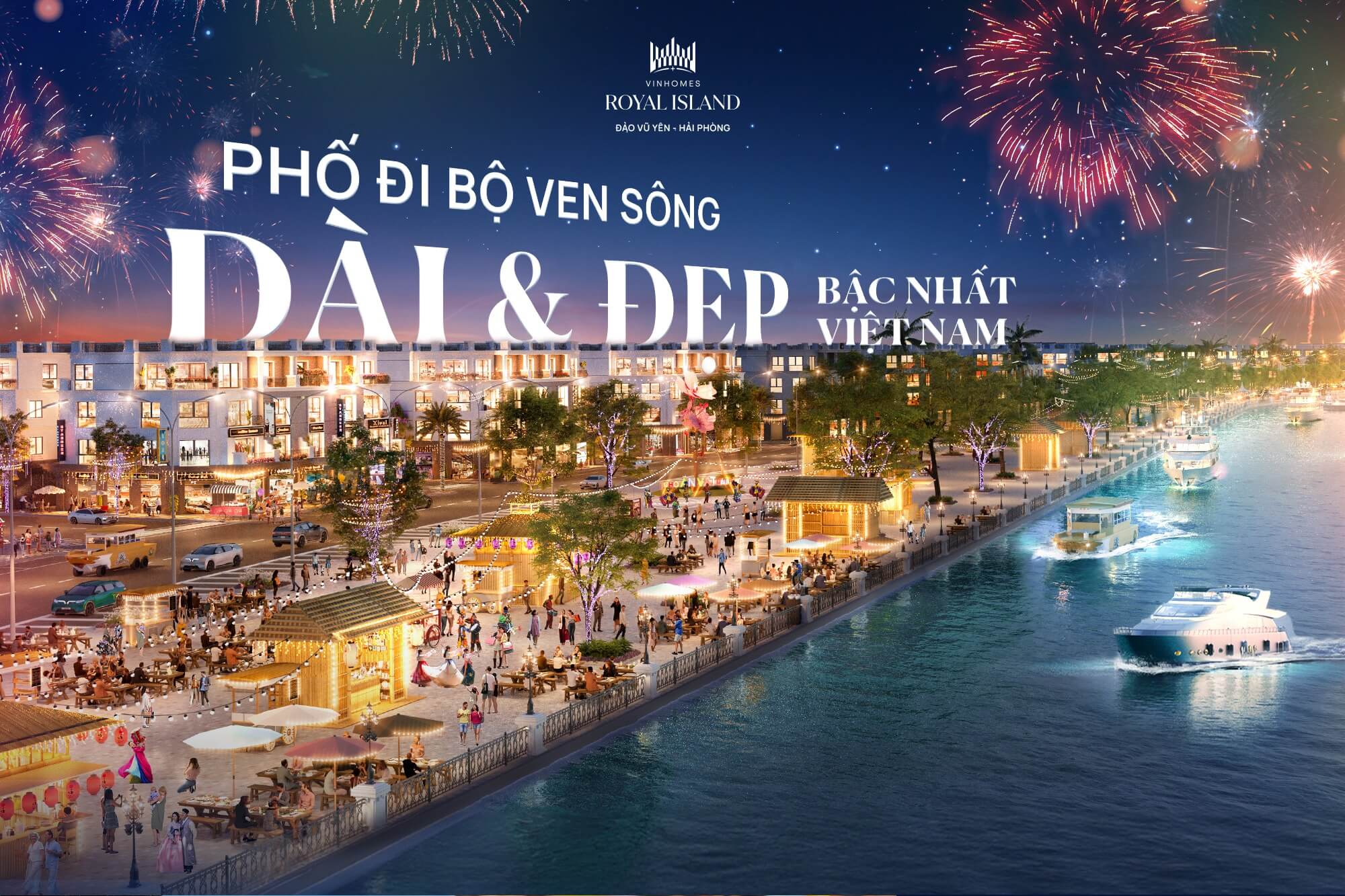 Tại Thành phố Đảo Hoàng Gia Vinhomes Royal Island, phố đi bộ ven sông dài và đẹp nhất Việt Nam mang tên River Walk cũng đang dần hiện diện. Với vị thế đắc địa tọa lạc gần kề sông Cấm, tầm view trực diện thành phố cùng nhiều lợi thế đắt giá, nơi đây hứa hẹn trở thành không gian mua sắm, ẩm thực, vui chơi giải trí hấp dẫn bậc nhất Đất Cảng: