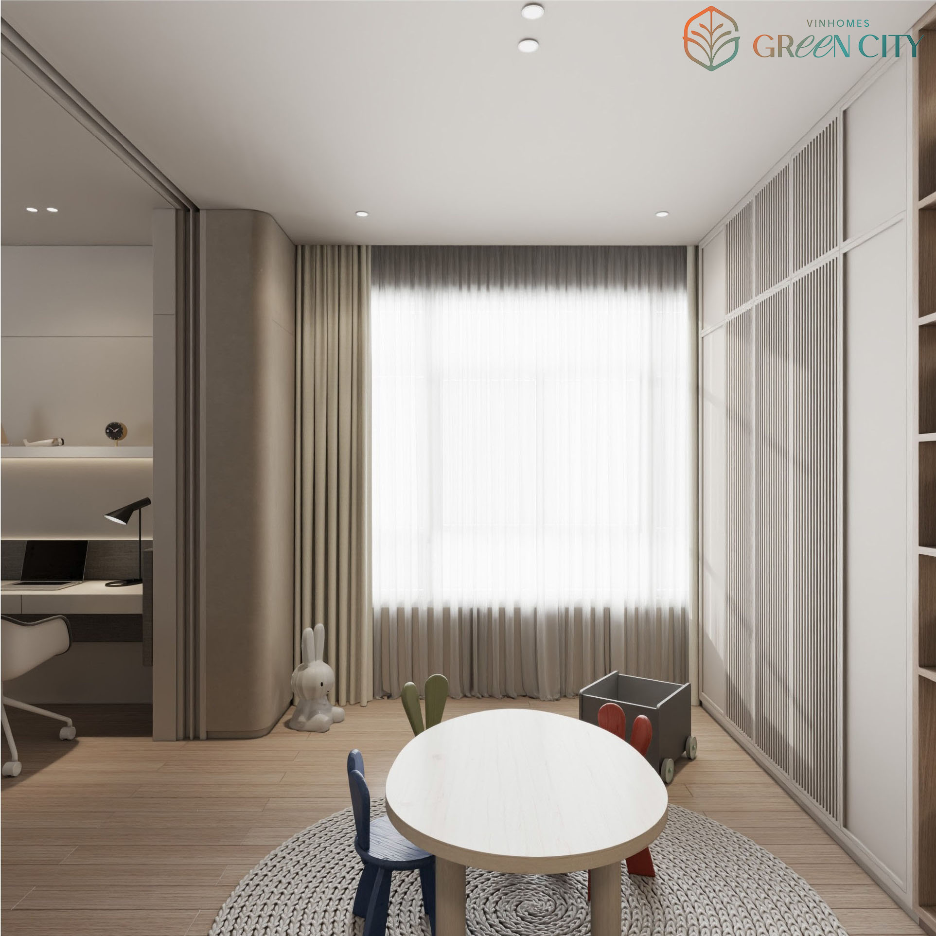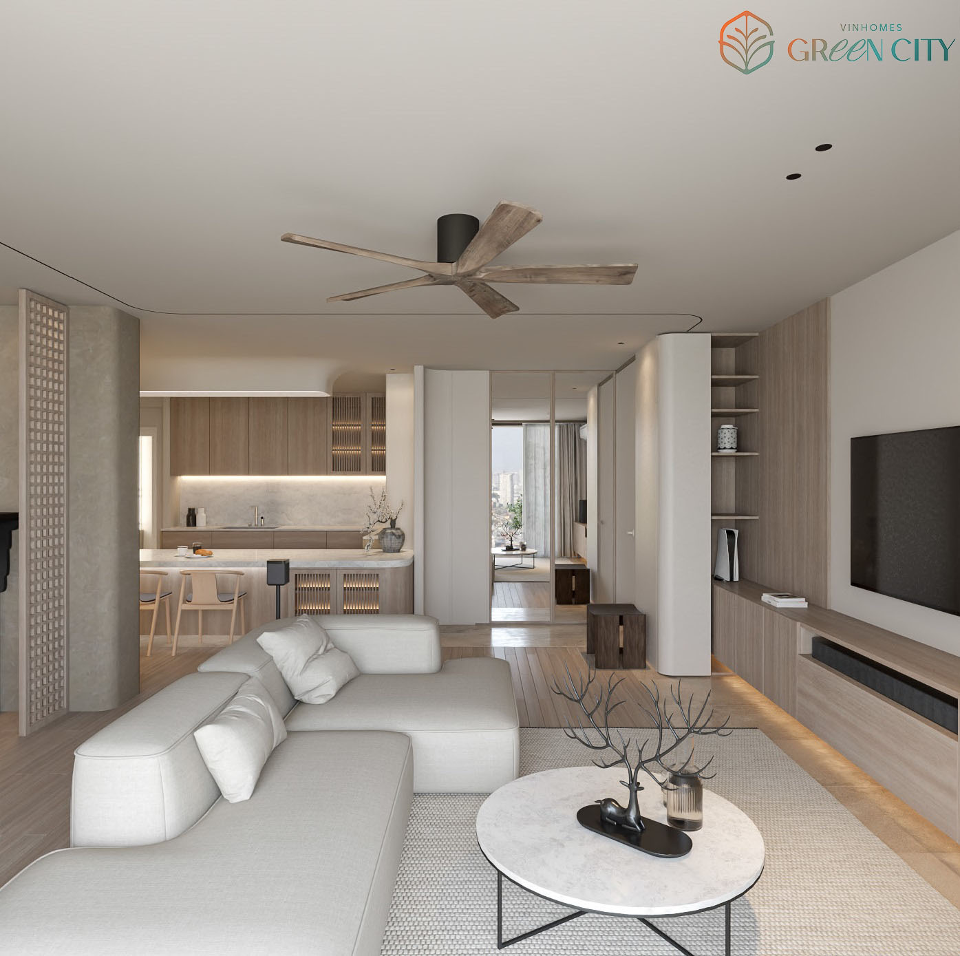 Các khu vực dành cho không gian sinh hoạt chung căn hộ Vinhomes Green City như phòng khách, phòng bếp và khu vực bàn ăn được đặt nối liền nhau, không vách ngăn. Do đó, các thành viên trong gia đình có thể dễ dàng kết nối và giao lưu với nhau. Bên cạnh đó, hệ thống cửa sổ lớn làm từ kính cường lực đặt tại phòng ngủ còn giúp cho ngôi nhà trở nên thoáng mát hơn, đồng thời thuận tiện đón nắng, đón gió vào không gian sống. Khu vực bếp đặt kế bên cửa ra vào giúp hạn chế việc đồ dùng ám mùi đồ ăn.